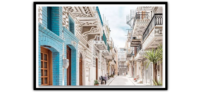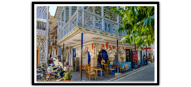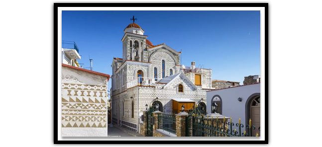 Sakız Adası’ndaki Mesta, Olympi, Vuno ve Kalamoti gibi ortaçağ köylerinden biri olan Pyrgi, evlerin cephelerinde bulunan kazıma ( Kysista) tekniği ile yapılmış geometrik ve floral motifli süslemeleri ile ünlüdür.